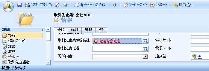 取引先企業の親会社が設定済みのフィールドのLOOKUP検索ダイアログボックス表示ボタンをクリックします。