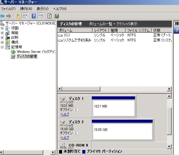 続いて、フェールオーバークラスタリングを実装する各サーバーのiSCSIイニシエーターを設定して下図(ディスク1,ディスク2)のようにオフラインでディスクに接続した状態にしておきます。iSCSIイニシエーターの設定でサーバーを起動すると自動的に接続を行うように設定しておいてください。ディスクをフォーマットしていない場合は一度オフラインにしてフォーマットをしておいてください。