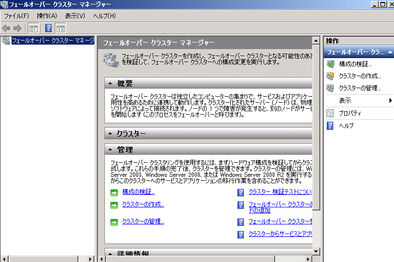 構成に問題ないことを確認したらクラスターを作成します。フェールオーバークラスターマネージャーの画面で、管理セクションのクラスターの作成をクリックします。