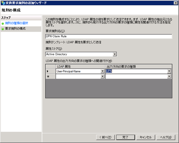 要求規則名に適当な名前(下図では UPN Claim Rule) を入力します。属性ストアに Active Directory を選択します。 LDAP 属性の出力方向の要求の種類への関連付けに、下図のように、LDAP属性に User-Principal-Name, 出力方向の要求の種類に UPN を選択します。完了ボタンをクリックします。