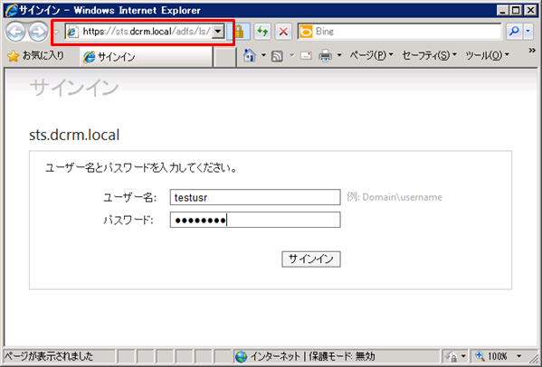 フォームのサインイン画面が表示されます。アドレス欄のURLを確認すると、 ADFS2.0サーバーにアクセスしていることが確認できます。