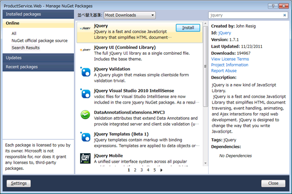 次のjQuery を用意します。CDNでホストされているjQuery を参照したり、 jQuery をダウンロードしてもよいのですが今回は NuGet を使用します。NuGetを起動して Online から jQuery を検索して jQuery をInstall します。本記事では 1.7.