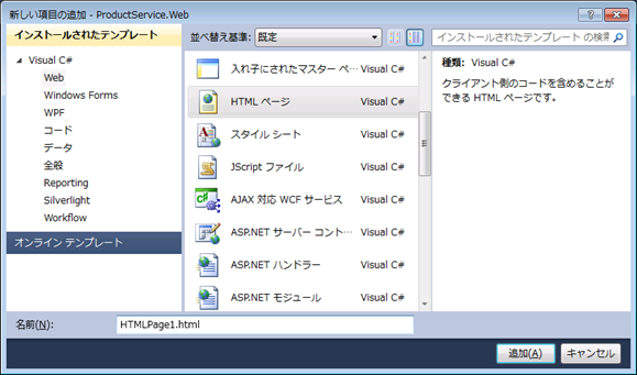 動作していることが確認できたら、クライアントからWCF Ajax サービスを呼び出してみます。Webアプリケーションプロジェクトに新しい項目を追加します。HTMLページをテンプレートとして選択しファイルを追加します。本例では HTMLPage1.html としています。