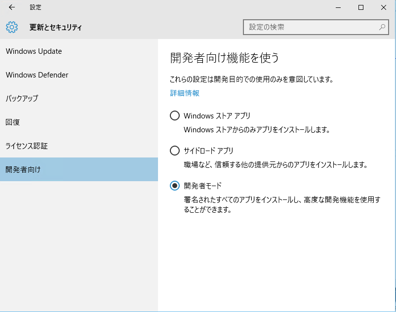 スタートメニュー> 設定 > 更新とセキュリティ をクリックして、 開発者向け タブを選択して、 [開発者モード] を選択します。これにより、Visual Studio 2015でビルドしたUWPアプリを動かすことができるようになります。