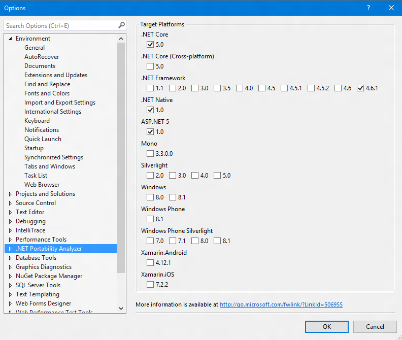 インストール後、Visual Studio 2015を再起動し、[ツール]>[オプション]をクリックします。オプションの .NET Portability Analyzer を選択して、互換性をチェックしたい .NET FrameowkのバージョンやプラットフォームにチェックするだけでOKです。