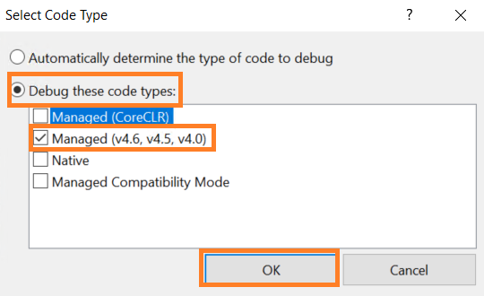 Debug these code typesを選択し、 Managed(v4.6,v4.5,v4.0) にチェックして、OKをクリックします。